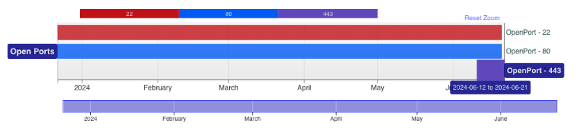 Starting with observed passive DNS (pDNS) resolutions for the domain, you can see that the top entry showed the site resolving to "80.76.49.112" on 11JUN2024, but with a slightly different IP than the one in the Tweet which started with "80.75". This could indicate a potential typo in the original post but for due diligence I checked both for historical scans of the IP addresses. Below you can see that 80.76 started listening on TCP/443 around 12JUN2024.